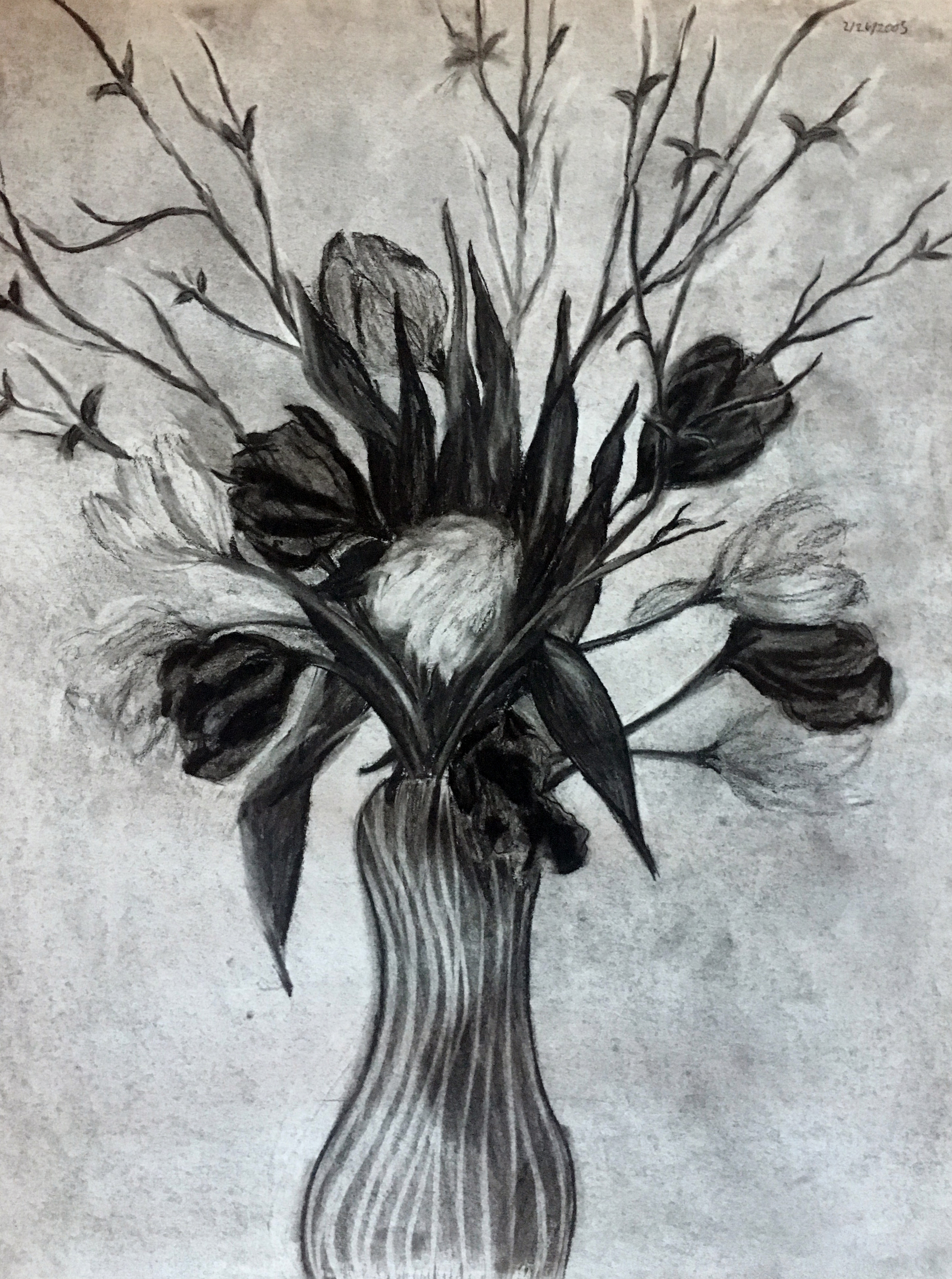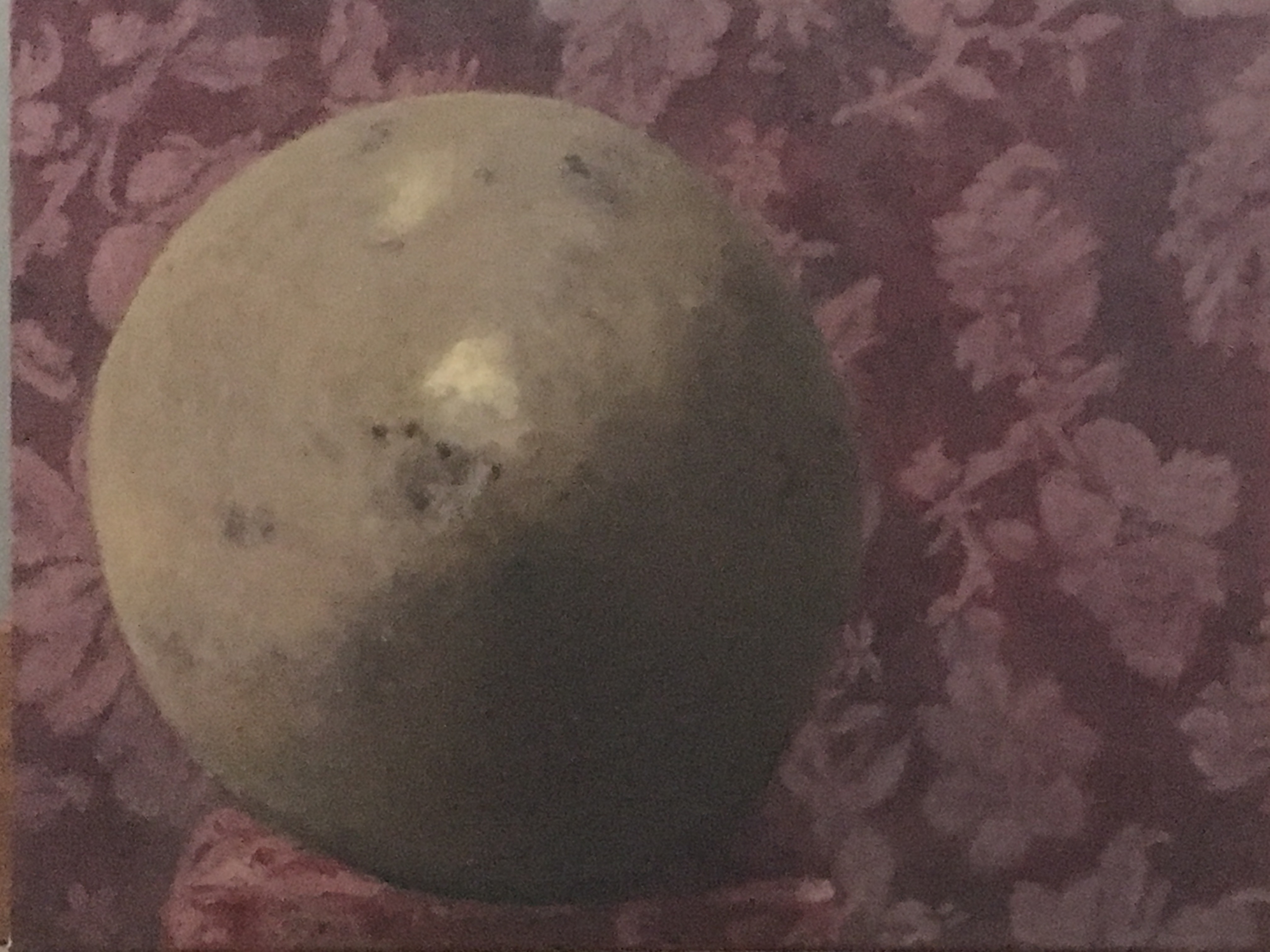 Still life in oil. Granite boulder with focused light and printed cloth background.